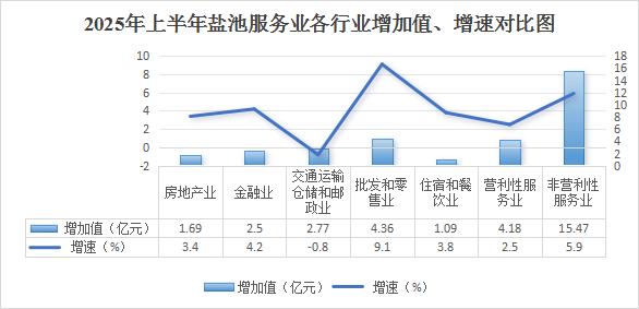 上半年以来,我县服务业虽然呈现稳步增长的运行态势,但相较于去年同期数据来看仍然略有差距,带动全县GDP增长速度有所下滑,我县服务业发展仍需持续关注。2025年上半年,盐池县服务业增加值完成32.49亿元,同比增长5.1%,较去年同期下降0.4个百分点,占地区生产总值的34.6%,拉动地区生产总值增长1.8个百分点。