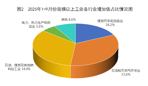 (四)分行业看,列统的15个工业行业大类中,10个行业增加值同比完成增长,增长面为66.7%。其中四大主导行业呈现“三增一降”态势。石油煤炭及其他燃料加工业增长37.7%,较上年增加10.8个百分点,拉动规上工业增加值增长10.2个百分点,贡献率达到114.4%;电力、热力生产和供应业增长2.5%,较上年回落6.6个百分点,拉动规上工业增加值增长0.2个百分点,贡献率达到1.7%;石油和天然气开采业增长1.2%,较上年回落3.3个百分点,拉动规上工业增加值增长0.4个百分点,贡献率为5.0%;煤炭开采和洗选业下降18.9%,较上年回落27.4个百分点,下拉规上工业增加值4.6个百分点,贡献率为-52.1%。