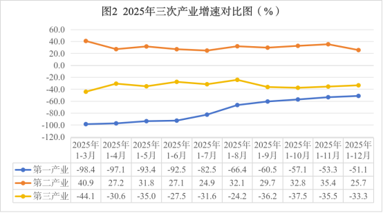 (一)从结构看,二产增速明显,一、三产业下滑严重。2025年第一产业投资额0.1亿元,同比下降51.1%,占投资总量0.1%,下拉投资增速0.1个百分点;第二产业投资额116.5亿元,同比增长25.7%,占投资总量85.4%,上拉投资增速19.5个百分点;第三产业投资额19.8亿元,同比下降33.3%,占投资总量14.5%,下拉投资增速8.1个百分点。