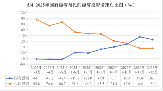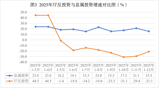 (三)从投资主体看,国有经济平稳上升,民间投资大幅下降。2025年国有经济投资额80.6亿元,同比增长26.2%,占全县固定资产投资总量的59.1%,上拉投资增速13.7个百分点;民间投资投资额55.8亿元,同比下降5.0%,占全县固定资产投资总量的40.1%,下拉投资增速2.4个百分点。