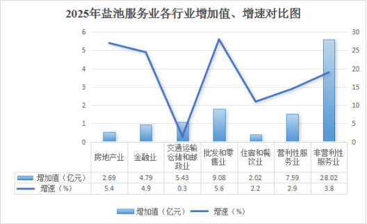 2025年以来,我县服务业虽然呈现稳步增长的运行态势,但相较于去年同期数据来看仍然略有差距,带动全县地区生产总值增长速度有所下滑,我县服务业发展仍需持续关注。2025年,盐池县服务业增加值完成60.69亿元,同比增长4.0%,较去年同期下降0.6个百分点,占地区生产总值的31.9%,拉动地区生产总值增长2.2个百分点。