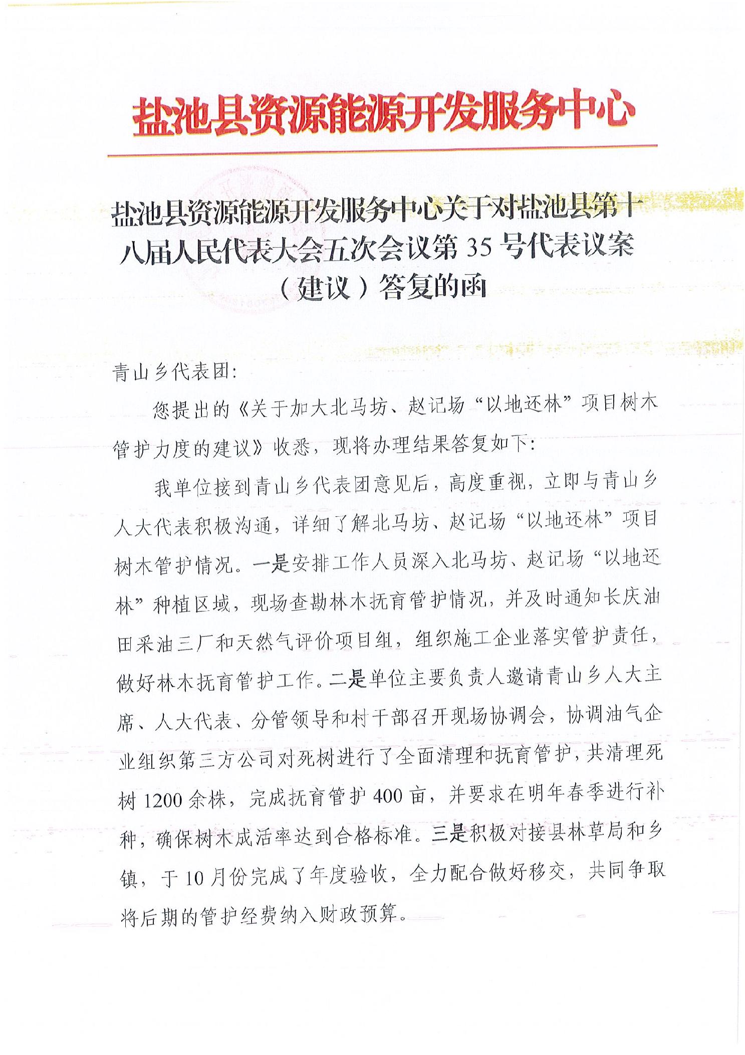 标 题: 盐池县资源能源开发服务中心关于对盐池县第十八届人民代表大会五次会议第35号代表议案(建议)答复的函