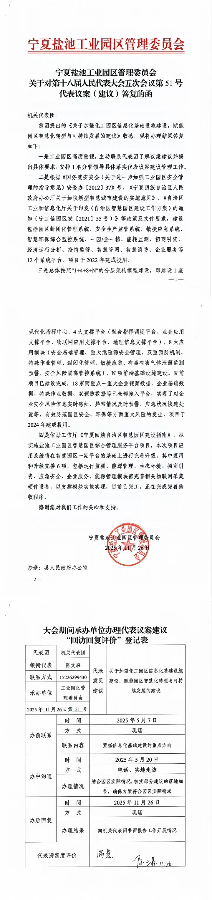 宁夏盐池工业园区管理委员会关于对第八届人民代表大会五次会议第51号代表议案(建议)答复的函