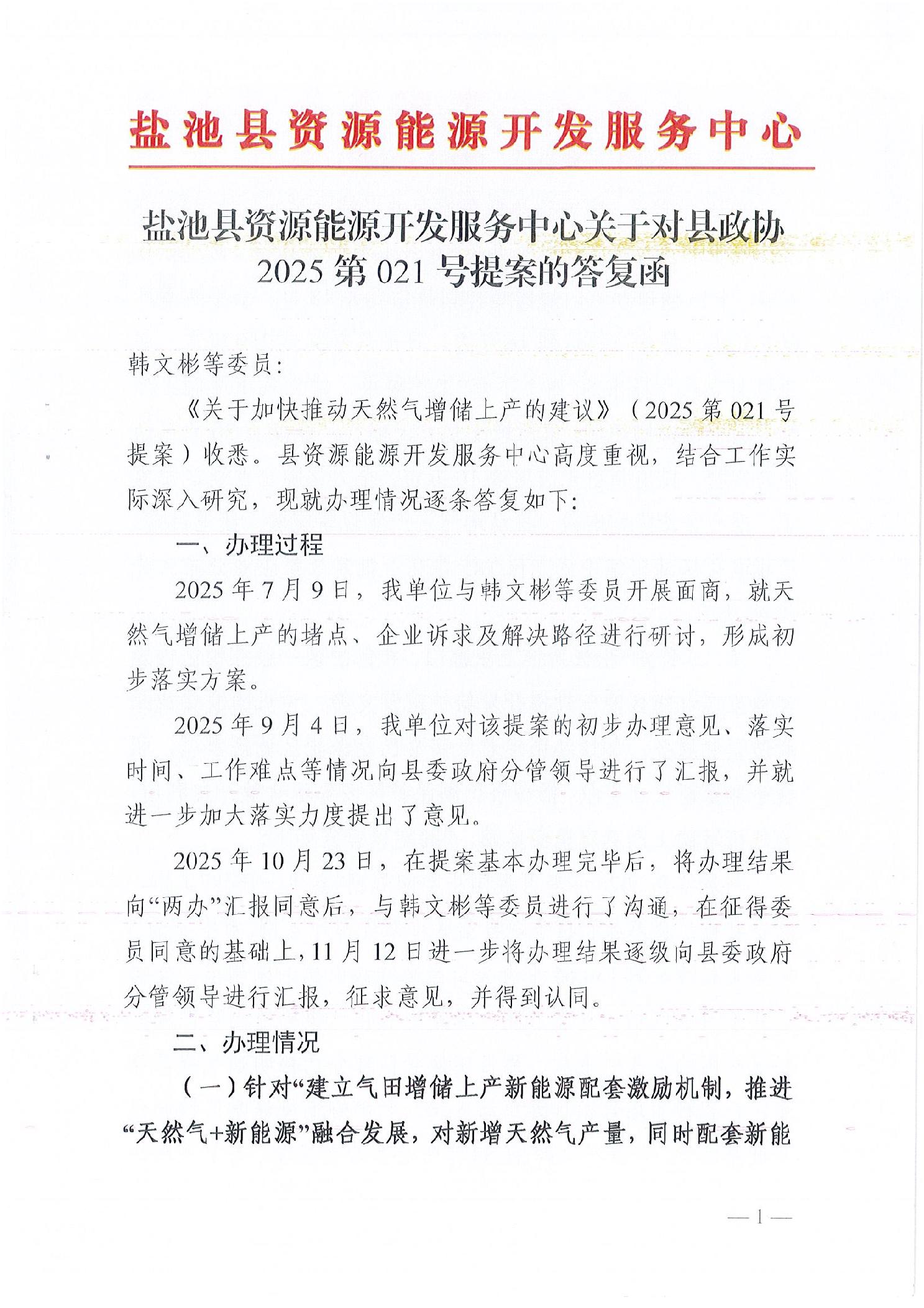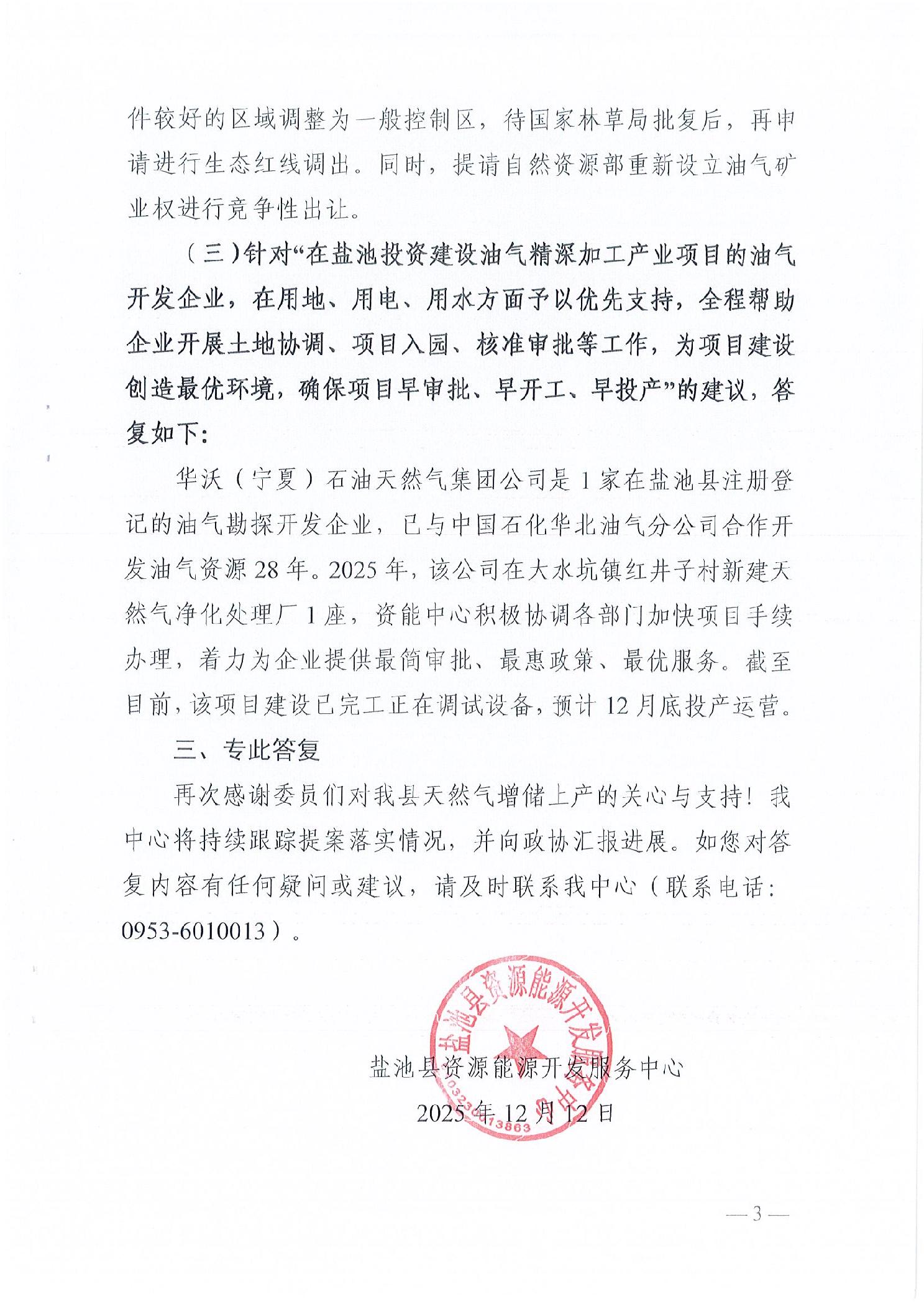 标 题: 盐池县资源能源开发服务中心关于对县政协2025第021号提案的答复函