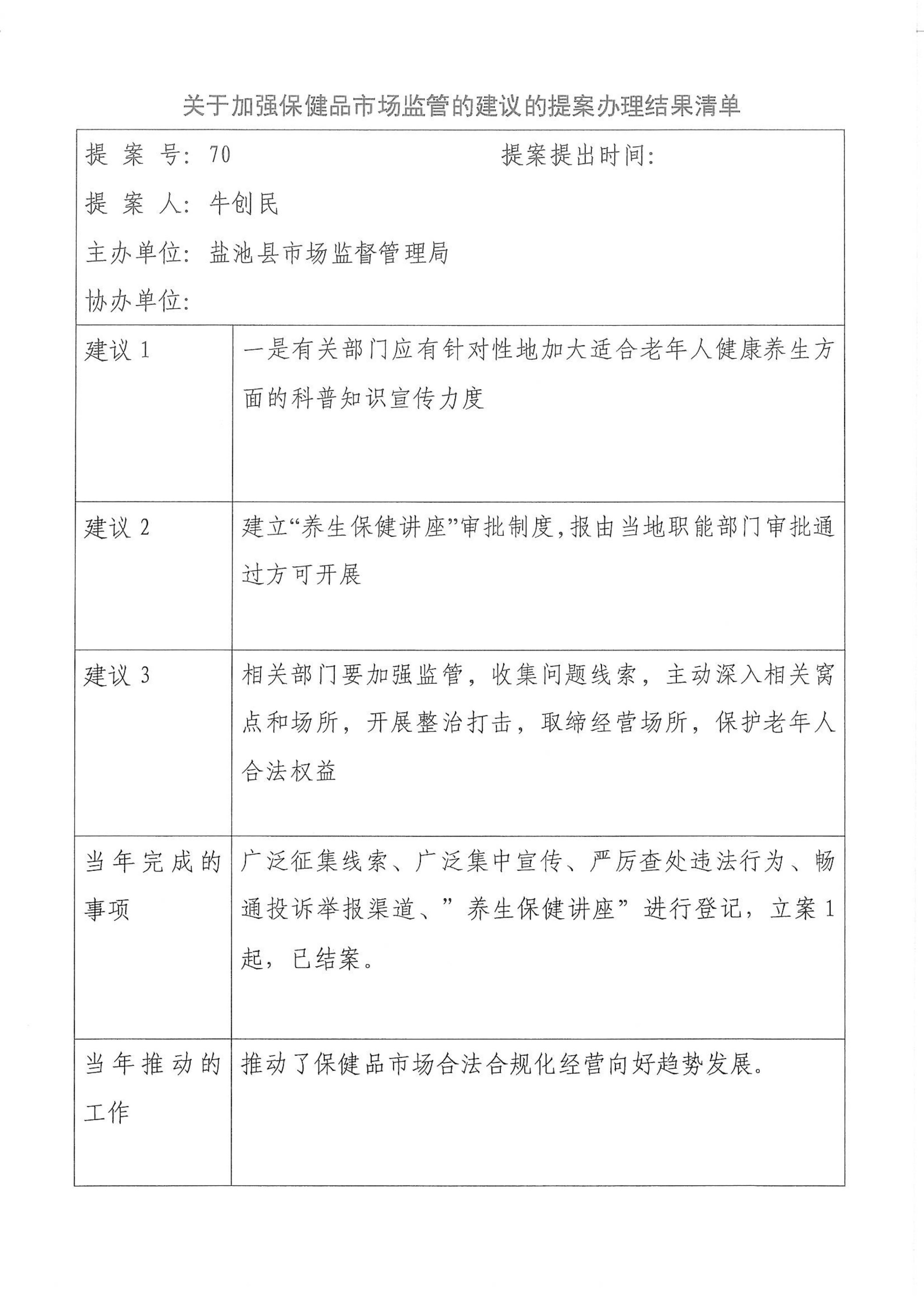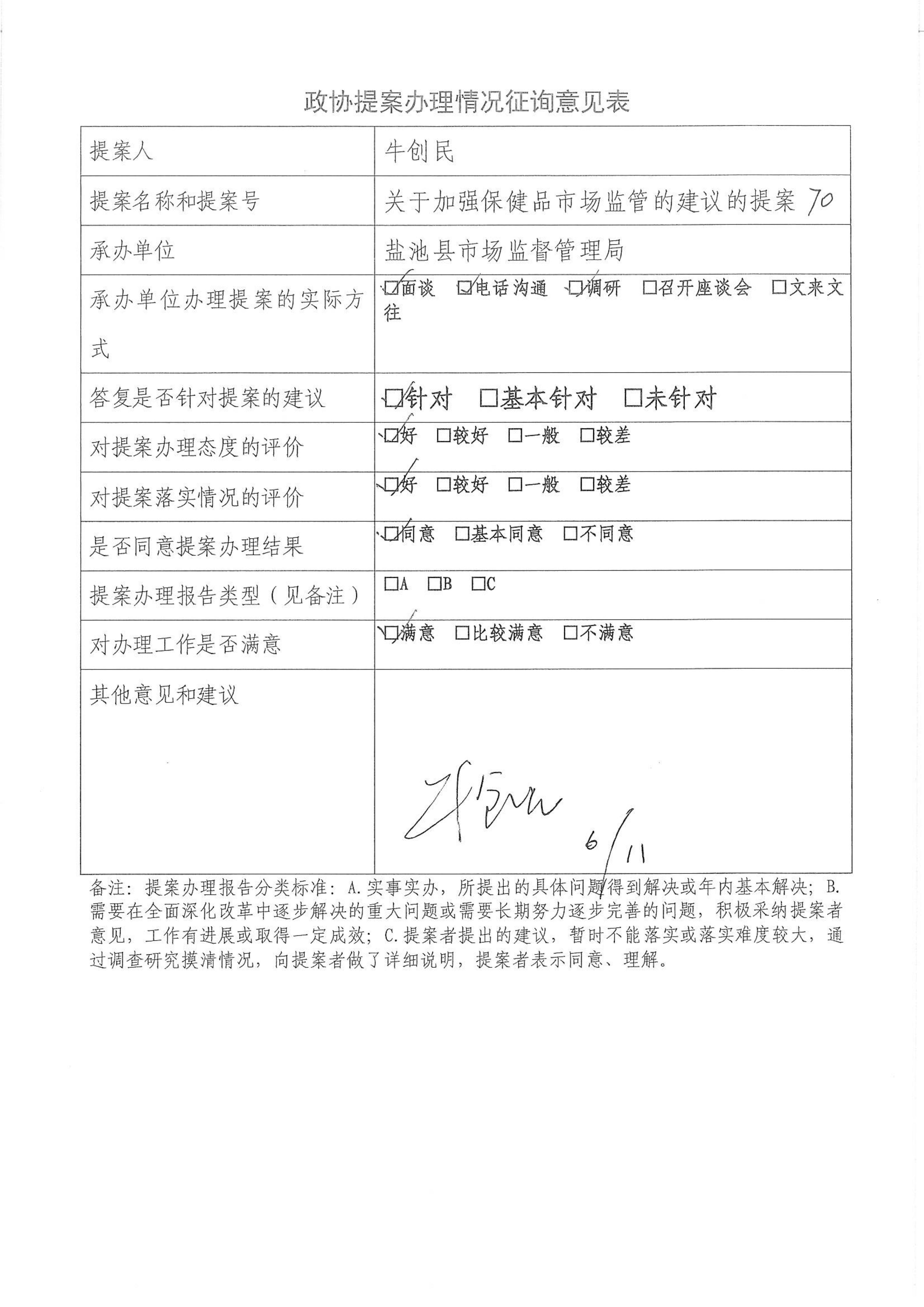 盐池县市场监督管理局关于对县政协70号提案的答复函