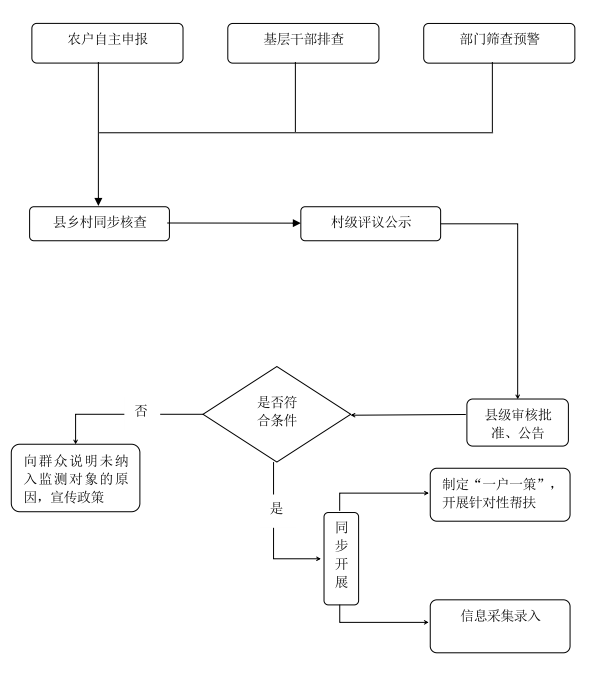 (2)信息采集方式:入户走访(重点走访未纳入低保或特困救助供养范围的残疾人家庭、无劳动力或弱劳动力家庭、有重病患者或慢性病人的家庭、遇到急难事项或意外事故的家庭等)、自主申报(乡镇服务窗口、党群服务中心或者APP)、基层上报、数据比对、热线信访、历史数据。
