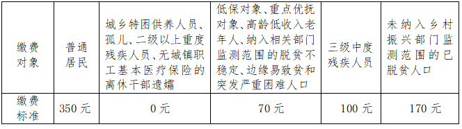①城乡居民医疗保险的缴费标准实行动态调整,2023年度居民医保个人缴费标准每人每年350元。对我区城乡特困供养人员、孤儿、二级以上重残人员、无城镇职工基本医疗保险的离休干部遗孀补助350元,个人不缴费;对重点优抚对象、高龄低收入老年人、低保对象,纳入相关部门监测范围的脱贫不稳定、边缘易致贫和突发严重困难人员,每人每年定额补助280元,个人缴费70元;对三级中度残疾人员定额补助250元,个人缴费100元;对未纳