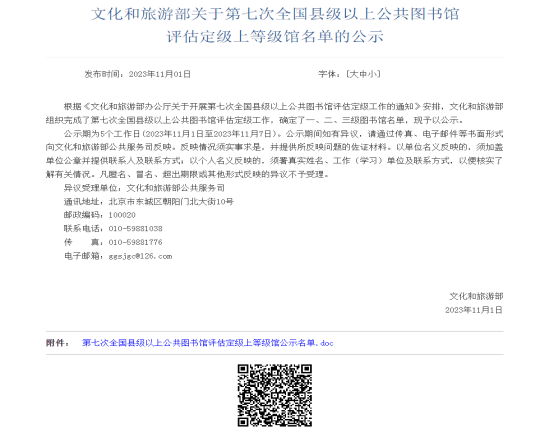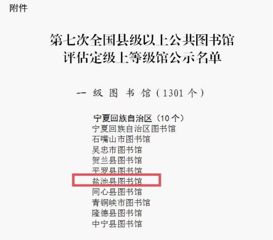 11月1日,文化和旅游部办公厅公示了第七次全国县级以上公共图书馆评估定级名单,经过自查自评、组织申报、自治区专家组实地验收、国家专家组实地复验、公示公告等程序,从服务效能、业务能力、保障条件三方面进行全面评估,盐池县图书馆获评国家县级一级公共图书馆。