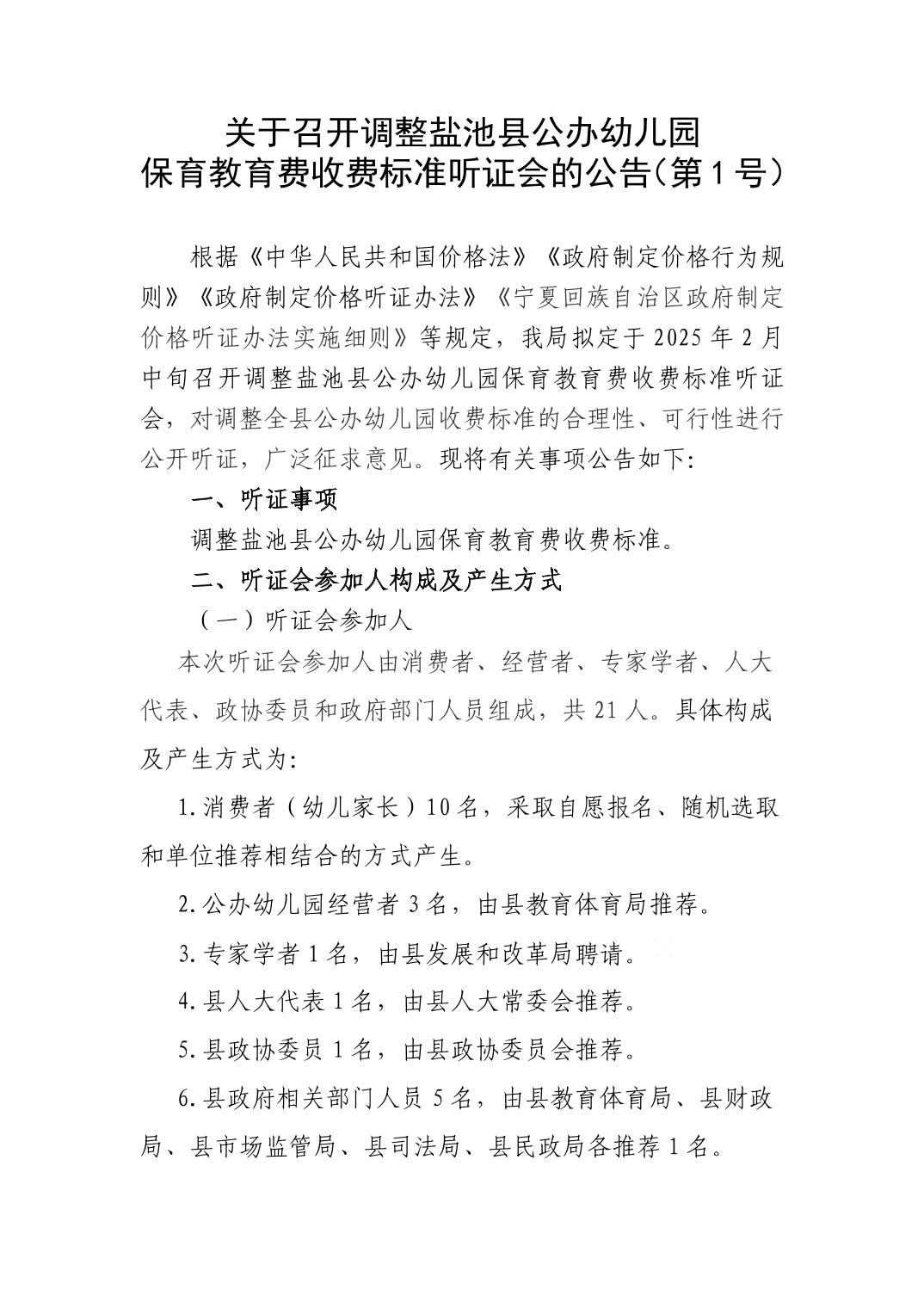 关于召开调整盐池县公办幼儿园保育教育费收费标准听证会的公告(第1号)